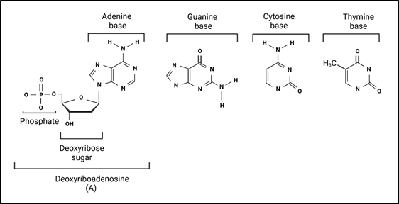 The deoxynucleotides are the basic building blocks of DNA, and each deoxynucleotide is in turn composed of three components: a phosphate group, a sugar molecule (called deoxyribose), and a molecule called a base (Fig. 2).